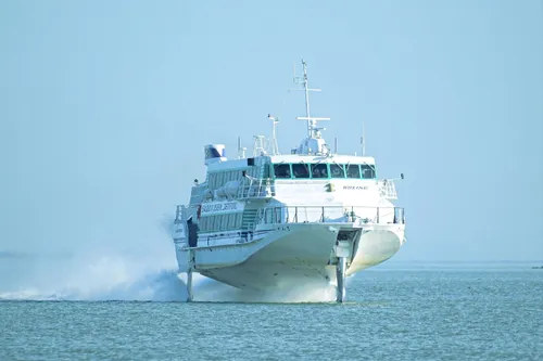 These high-speed Jetfoils, with capacities of 244–246 passengers, are designed to travel at 80 km/h even through rough waves up to 3.5 meters, thanks to their bodies being elevated above the seawater. They are propelled by water jet pumps driven by gas turbine engines, which inject approximately 150 tons of seawater per minute at a high pressure of 9 kg/cm². The vessels are lifted above the water by hydrofoils located at the front and rear of the hull, allowing them to “fly” over the sea’s surface—earning the nickname “airplanes in the sea.” All three Jetfoils navigate daily between Niigata Port and Ryotsu Port, providing fast and smooth transport across the waters.